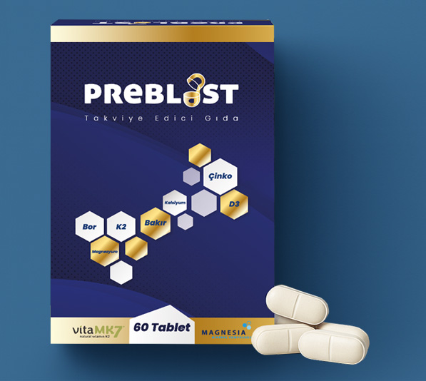 Preblast içeriğinde; Kalsiyum, Magnezyum, Bor, D3 vitamini ve K2 vitamini, Çinko ve Bakır içeren kemik ve kas sağlığını destekeleyen takviye edici gıdadır.